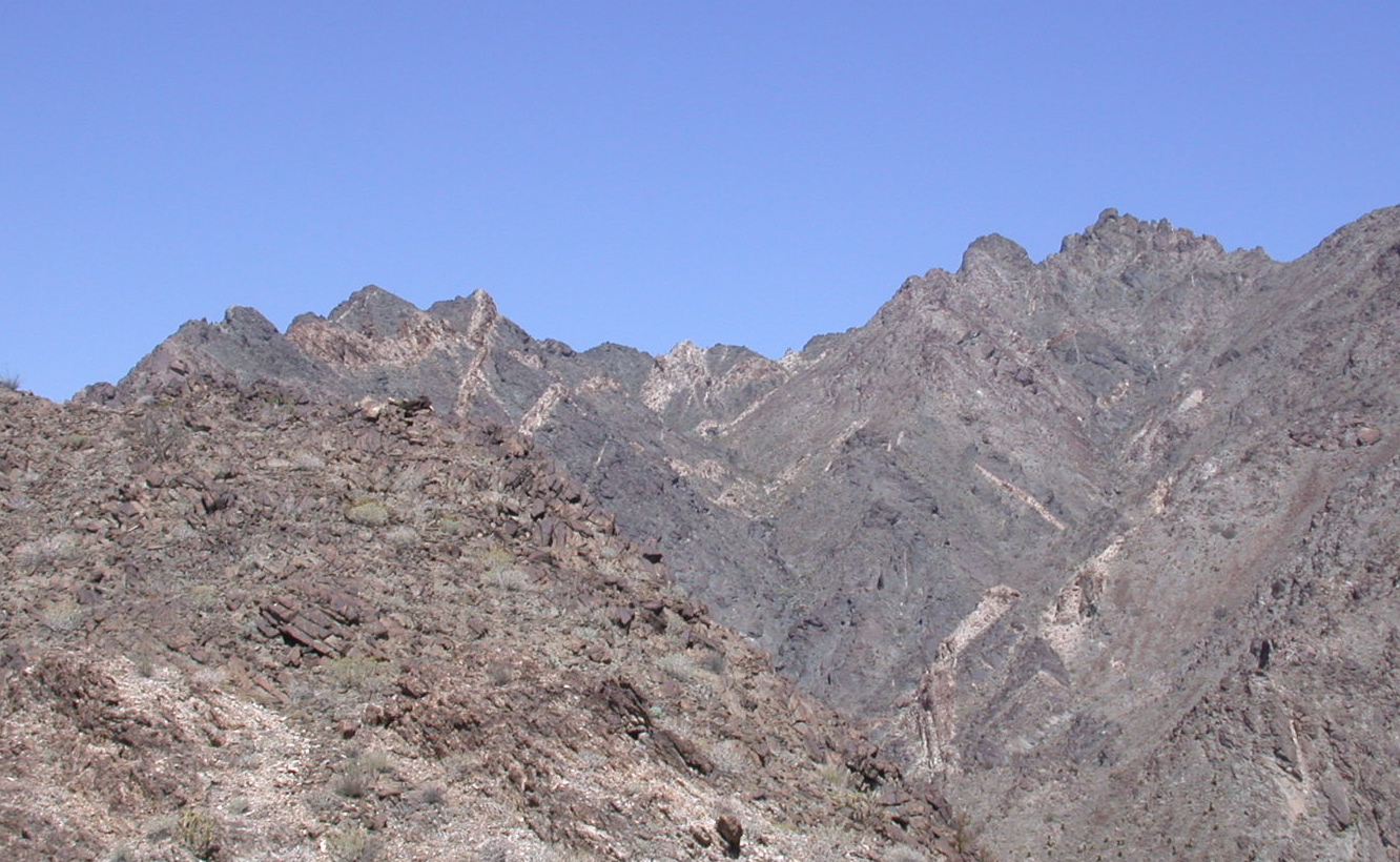 Look at the vivid difference between the stark rock mountain and blue sky.  Looking north from a gold mine on the side of a mountain at about 1300 feet.